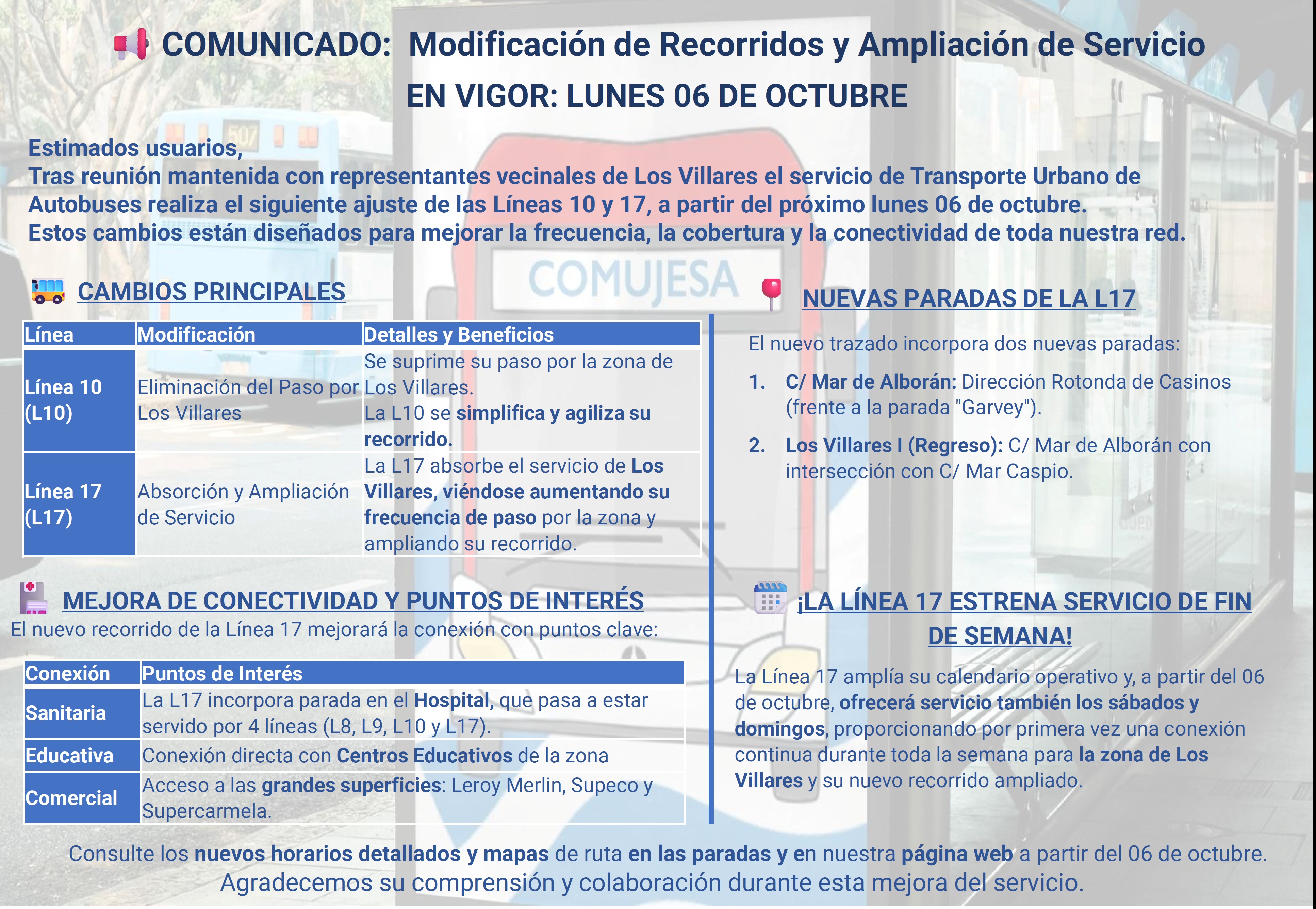 El servicio de Transporte Urbano de Autobuses se complace en anunciar la modificación de los recorridos de las Líneas 10 y 17, así como una importante ampliación del servicio de la Línea 17 a partir del próximo lunes 06 de octubre.