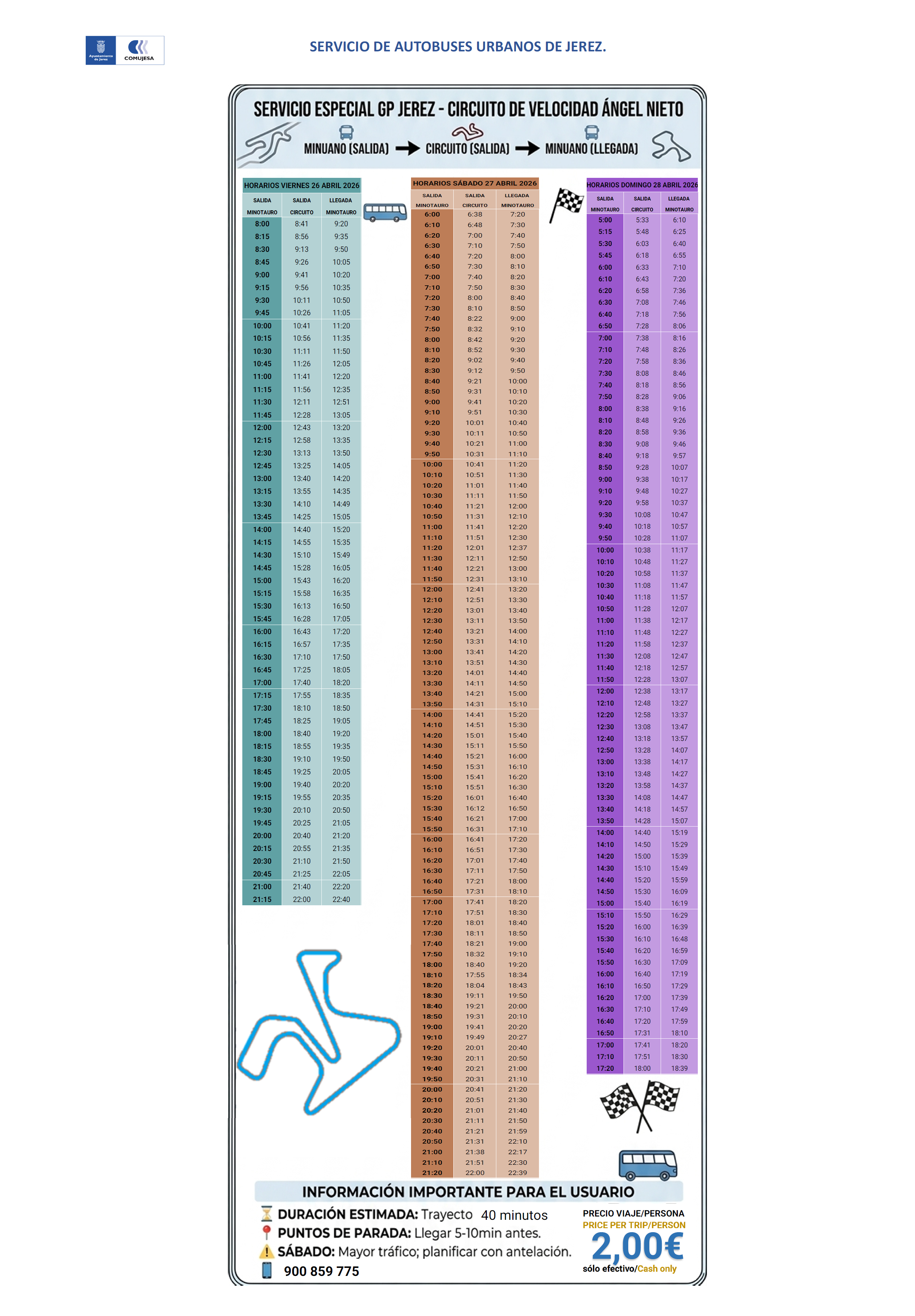 La tarifa será de billete único a 2€ por viaje y persona, siendo NO Válidos los títulos de Transporte de los Autobuses Urbanos de Jerez